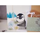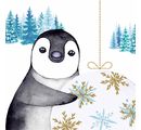 Cute napkin "Penguin in winter" as a quarter motif in white. The cute penguin holds a large gold/blue designed Christmas bauble and fir trees can be seen in the snowy background.
