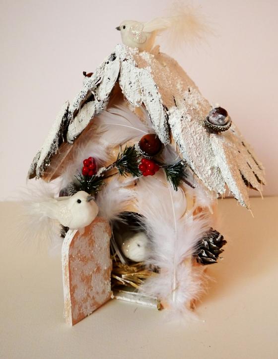 Poursuivez la décoration du nichoir en collant à chaud des plume blanches sur les façades du nichoir, agrémentez-les branches de sapin que vous aurez préalablement sectionnées à la pince coupante et que vous ponctuerez de boules de houx mais aussi de pommes de pin et de glands.