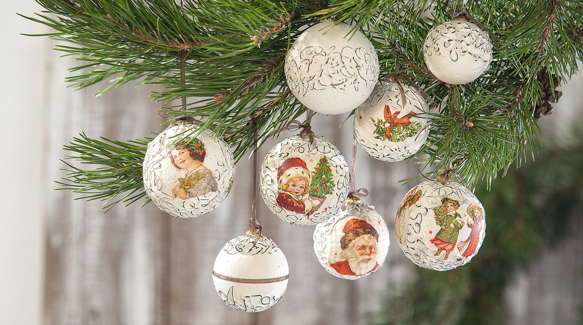 Tear the motifs just out of the Napkin and remove the two layers of white paper. Glue the printed layer on the free areas between the 3-D squiggles using Napkin varnish . After drying, fix the Organza ribbon with tape-Ribbon around the balls. Finally, turn the polystyrene suspensions into the balls and thread Organza ribbon through them. With the help of a needle you thread the Ribbon through the bead cap, knot it and tie a small loop.