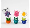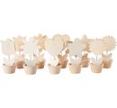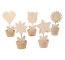Note holder "flower pots" as a set with a content of 10 pieces. The height of the small flower pots is approx. 10 cm and the width is between 4.3 and 5.8 cm. In the flower pots made of wood are in the middle small feathers made of metal attached. Here is a clamp which is decorated on both sides with motifs such as heart, star and flowers. The motifs are made of 1.5 mm thick plywood.