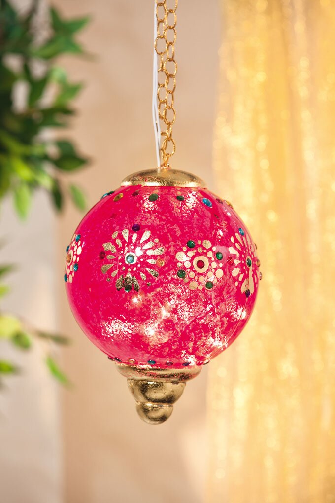 Glue various gemstones with gemstone glue in the golden stencilled motifs and around the upper and lower edge of the large sphere.