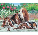 Painting by numbers "Bassethunde" with a size of approx. 38,2 x 29,2 cm. The motive are three cute bassets in front of a stone wall with flowers. The set contains 1 printed painting template, 12 colours, 1 brush and the instructions