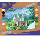 Painting by numbers "Neuschwanstein Castle" with a size of approx. 38.2 x 29.2 cm. In this set are 1 printed painting template, 12 colours, 1 brush and 1 instruction