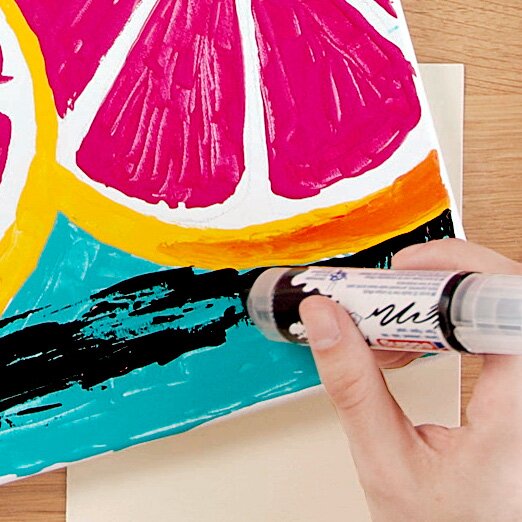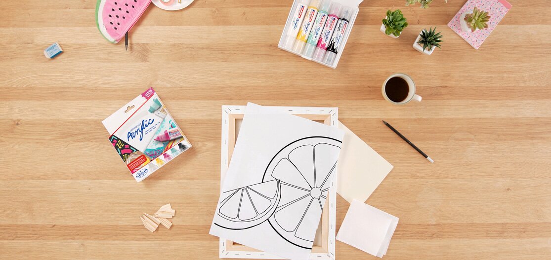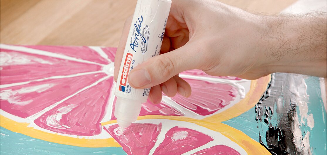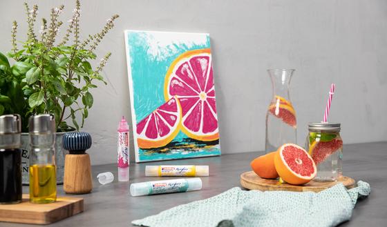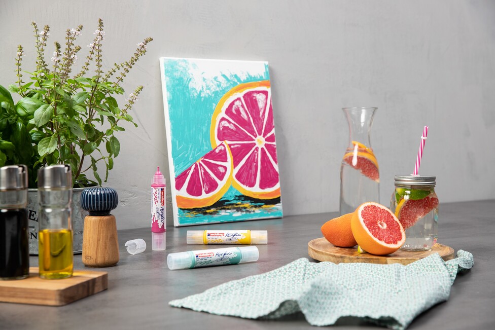 For the picture with the blood orange, it is best to use a stretcher frame in the format 24 x 30 cm, the edding acrylic marker set 5400 "Acryl 3D-Basic", Double Liner, set of 5 and the motif of a blood orange as a template.