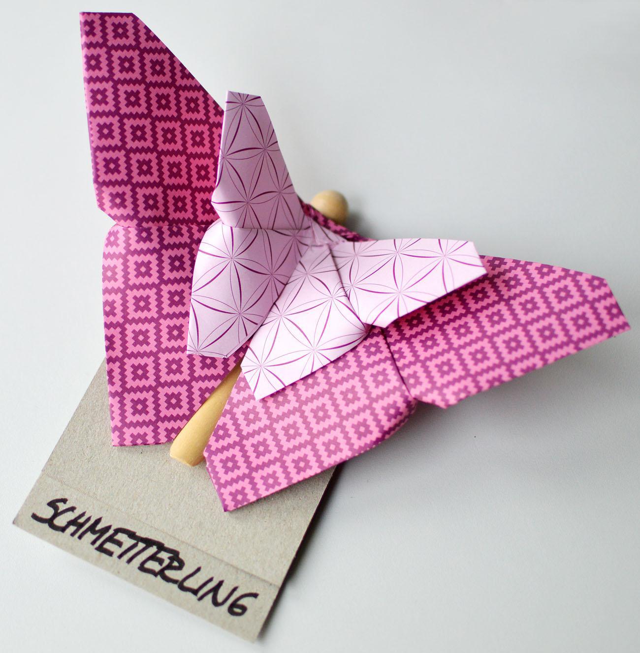 Congratulations! Your first origami butterfly is finished. You can now choose a different paper size to add a second butterfly. The three-dimensional effect is enhanced and you can let off steam creatively with the colors and patterns of the paper. The finished butterflies from Paper can now be stuck to the clothes pegs. It's practical that the nostalgic clothespin already looks like a butterfly body.