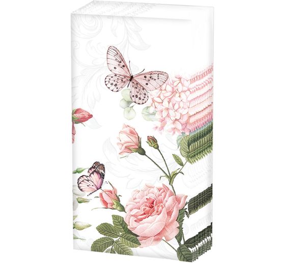 Bring spring into your home with the enchanting paper handkerchiefs "Amelia". The romantic motifs of delicate roses and butterflies exude a fresh, lively atmosphere. You can use the napkin technique to transfer this springtime splendor to a wide variety of surfaces such as ceramics, glass or fabric. Create unique decorative objects such as flower pots or picture frames. The napkin measures 21 x 21 cm and offers you four similar motifs for creative development. Let your imagination run wild and create lasting works of art!