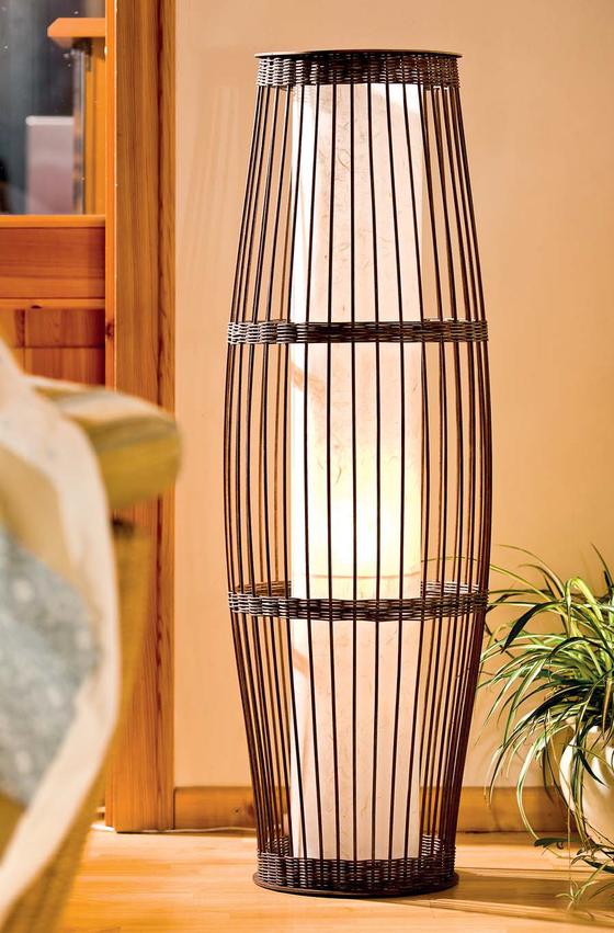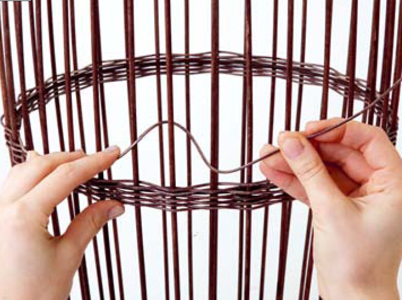 33 cm from bottom edge fix one lamp ring inside on six round rods with brown string, put the second ring provisionally over the rods so that they are bent into the right shape for braiding.