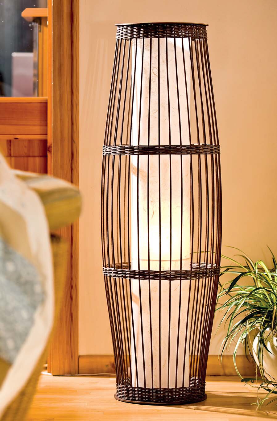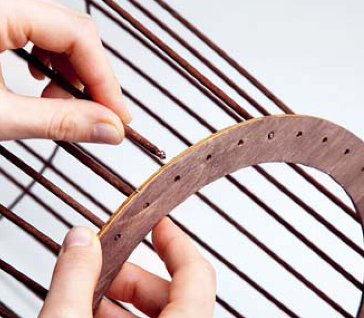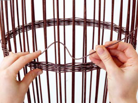 Turn the lamp upside down and fix the Rattan cane weave in the rhythm "before one, behind one", i.e. each bar goes around the next one on the outside and stays behind the next but one on the inside (see picture 5)
