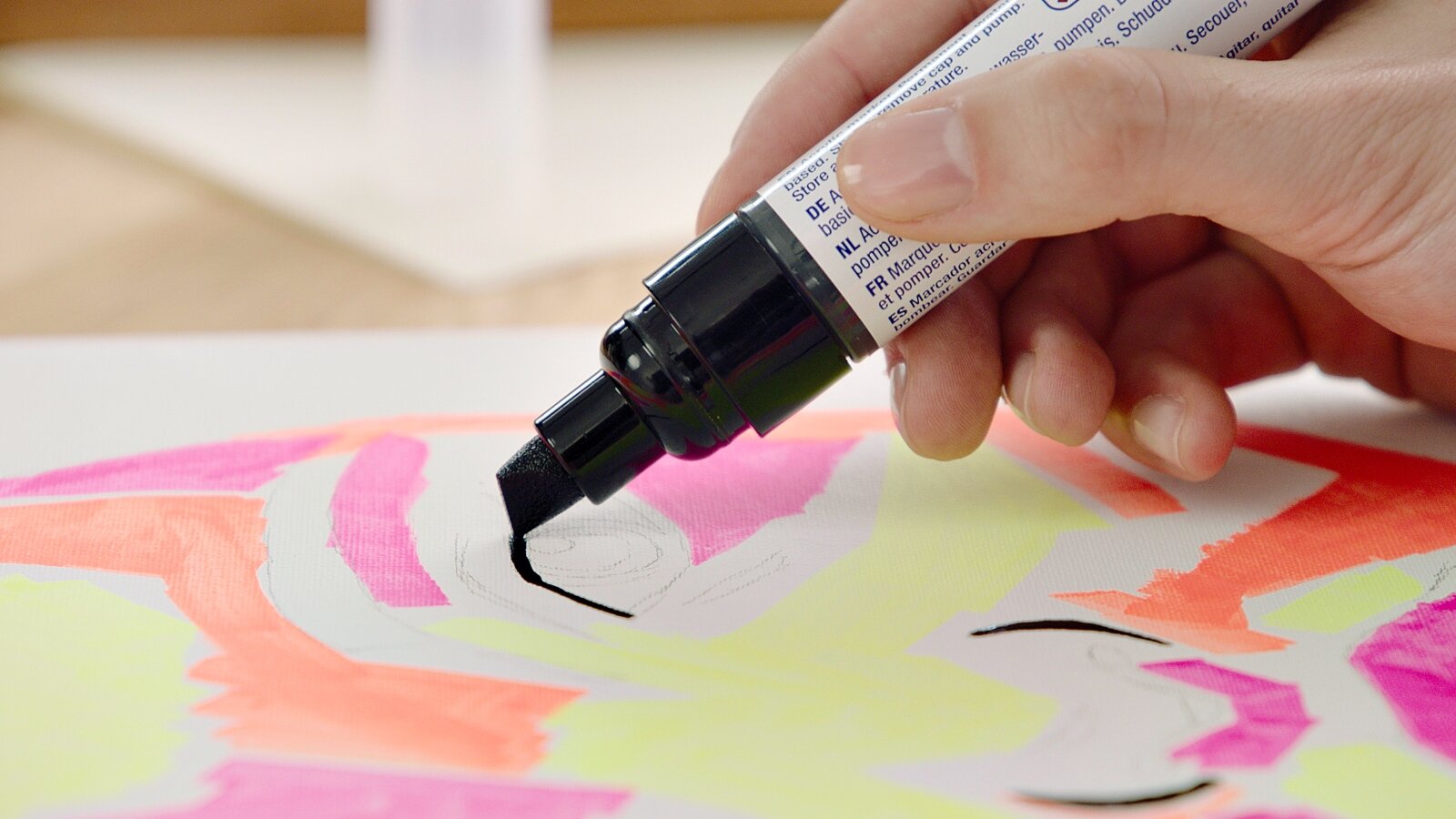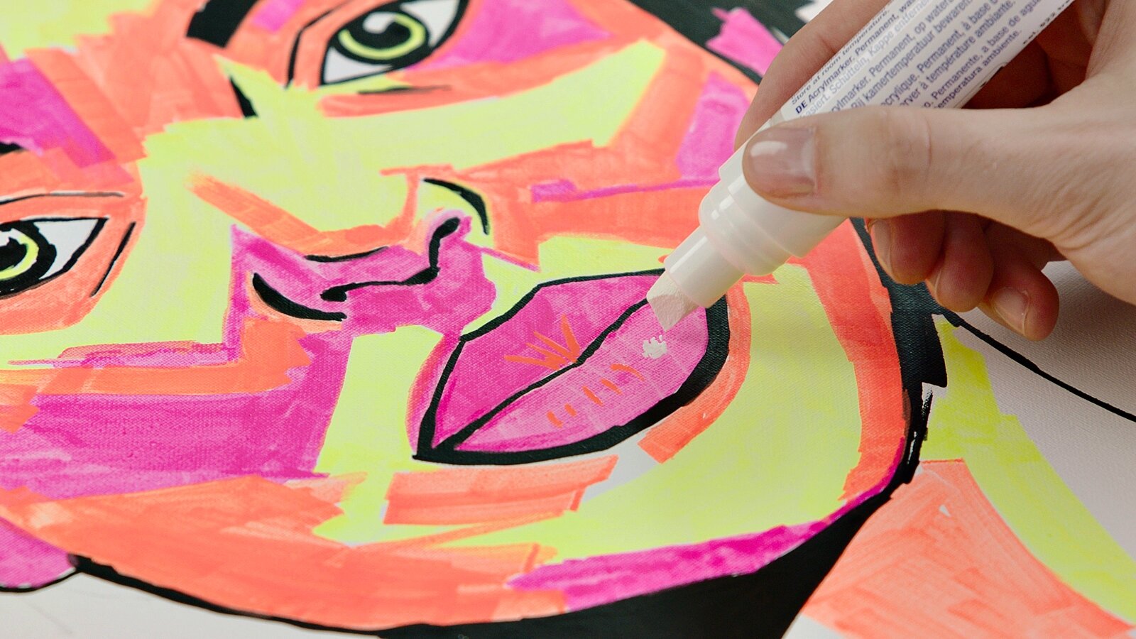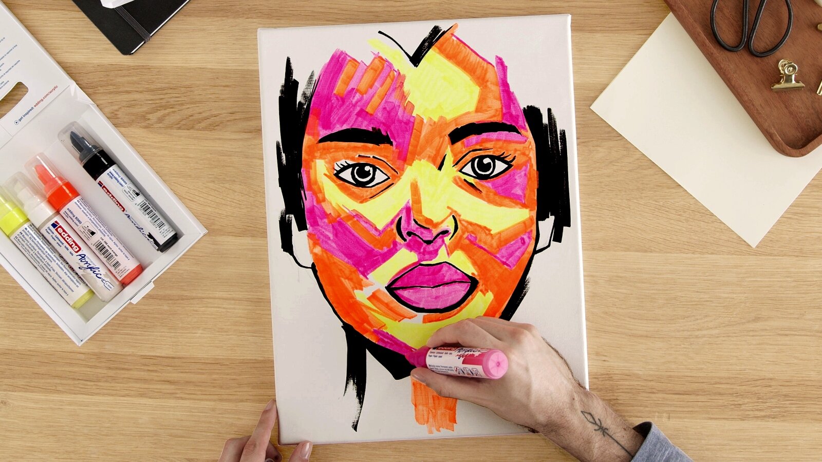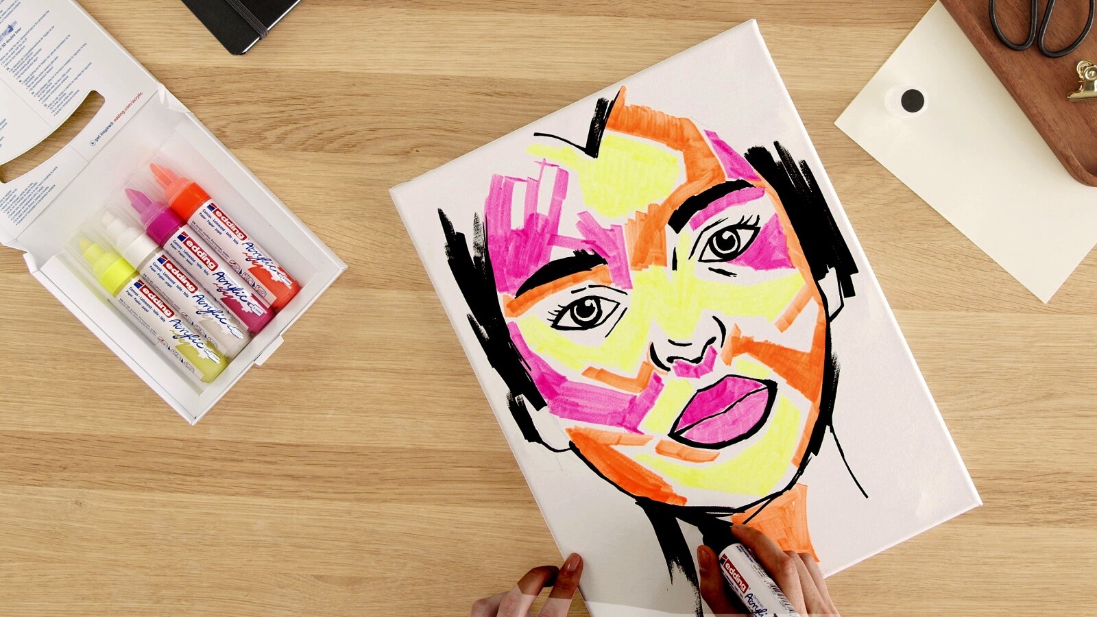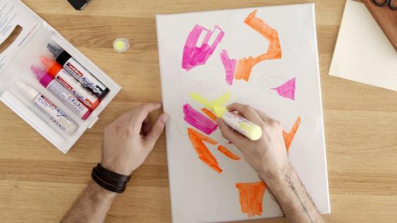 If you love bright colors and high-contrast artwork, you'll love this portrait. We'll show you how easy it is to create a portrait on canvas with edding acrylic markers in bright neon colors. If you prefer softer shades, you also have a great Selection of up to 26 opaque colors. The acrylic range consists of four different products, which you can use to paint large areas as well as create subtle accents. For an individual portrait, we recommend our template generator, with which you can easily create an individual template from a photo.