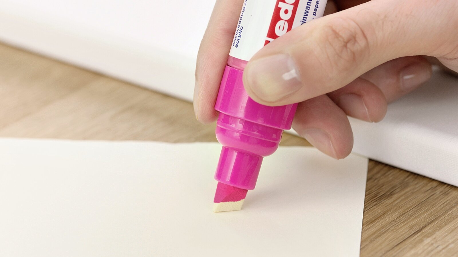 Before you start painting, activate the acrylic marker as follows: Shake the marker with the cap on until you hear the mixing ball inside the pen, then carefully pump up and down until the ink appears in the tip. When pumping, it is very important to hold the marker at a slight angle so that the chisel tip is not damaged. Mark the pen on a piece of Paper .