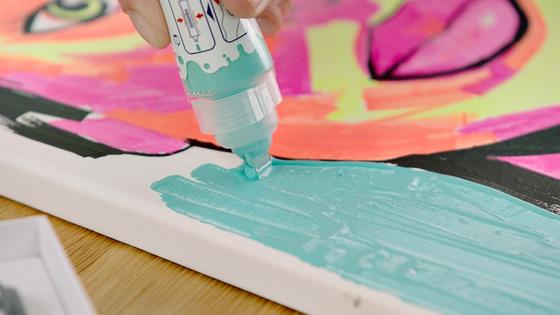 As an additional step, we recommend using a acrylic 3D double liner in high-contrast opulent turquoise. You can use the acrylic paste to create exciting effects and structures on the background. This gives the texture more than depth and the neon colors stand out even more.