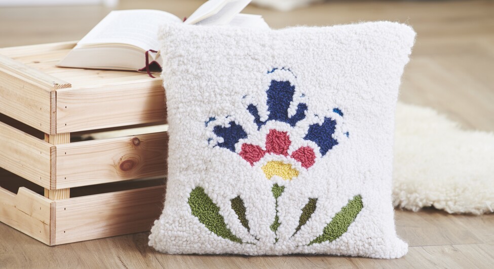 Decorative embroidery in 3D look is done by creating loops of different lengths, which are generated by the Punch Needle. The length of the loops can be adjusted on the needle itself. Thread the wool into your punch needle according to the instructions. Make sure that the thickness of the needle and the wool is correct. Now you can stitch your motif. The needle must always be completely pierced and the needle opening must point in the working direction. Work closely over the fabric and proceed slowly.