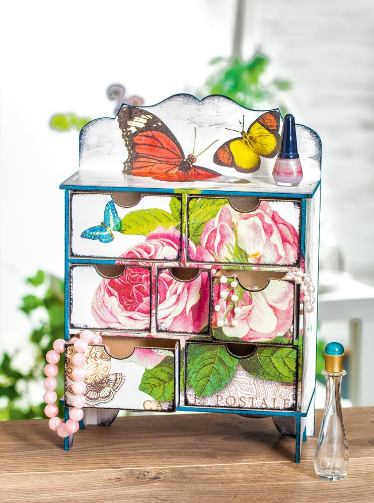 Prime the chest of drawers with Hobby Color in white and let it dry. Cut the motifs from Straw silk paper and glue them onto the chest of drawers with Napkin varnish