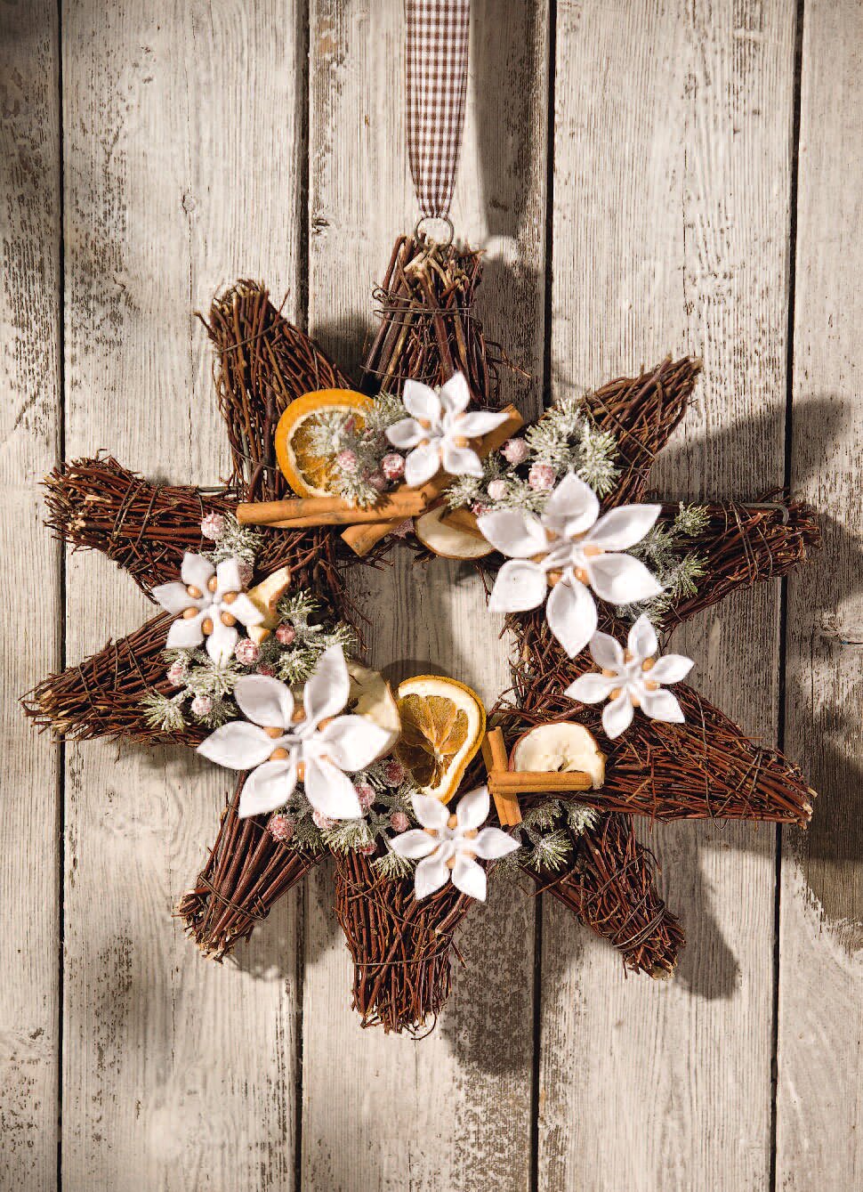 Now simply lay two willow stars on top of each otherand connect them with wire. First decorate the 3D star with apple slices, orange slices and the cinnamon sticks and then arrange the handmade Felt-Christmas stars on the arrangement. Everything can be easily fixed with hot glue.