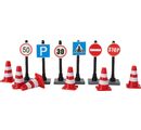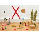 Here, everything is safely cordoned off and regulated. The pylons and traffic signs from speed limit to stop sign to marking a crosswalk as well as parking areas are important signs included. In combination with other miniatures, small cars, trees, tools, sand and co. creates a great scene with lots of detail.
