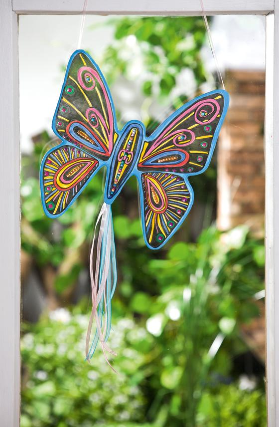 Use hot glue to attach a hanging from Organza ribbon , also knot several ribbons together and stick them to the bottom of the butterfly.
