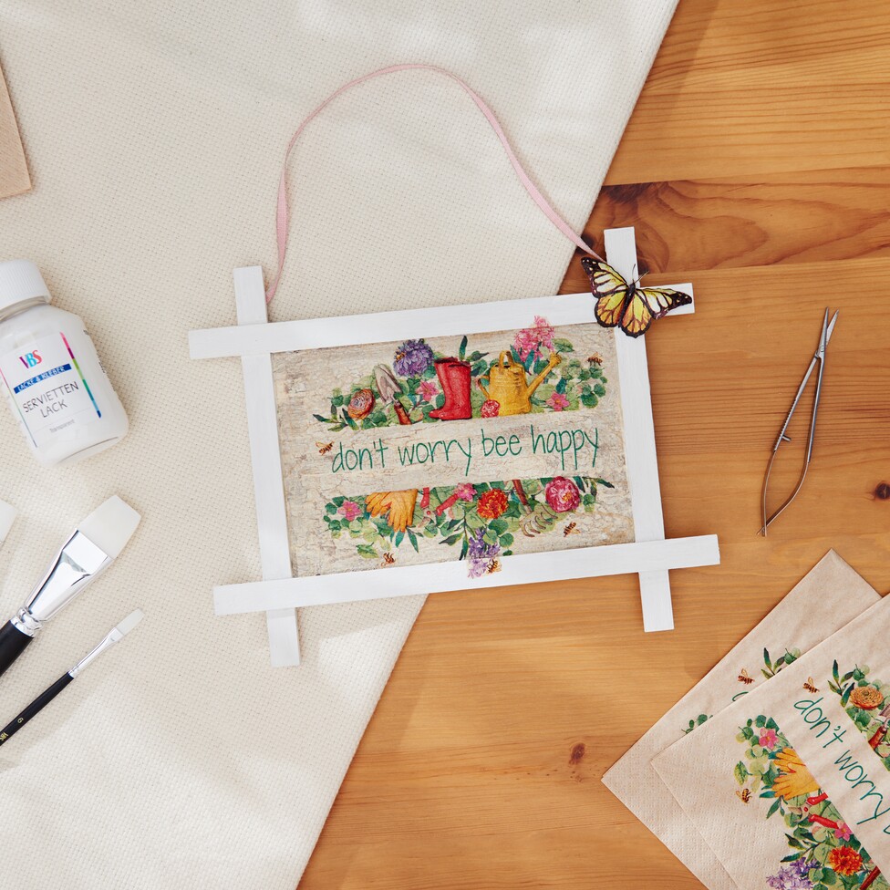 Then tear the motif out of the napkin. When everything is dry, paint the image section with napkin varnish and stick the top printed layer of napkin stick onto it. Then coat the whole thing again with napkin varnish again.