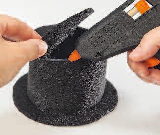 Make templates for the cylinder from the template, Felt transfer them to the cylinder and cut them out. Glue the long piece round together and on the brim of the hat, then fix the lid on it. Glue on the cylinder and decorate with decorative snow, glitter paste, mushrooms and Ice-pick.