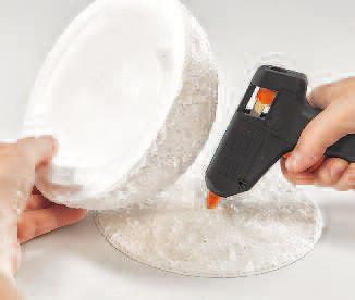 Polystyrene balls, -dab hemispheres and cutting discs with decorative snow, when dry dab glitter paste over them.