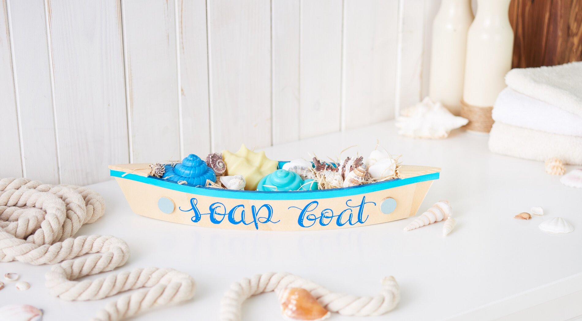 Fill the boat with wood wool and arrange the soap bars with some shells on the wood wool. You can also place more shells next to your soap boat - this decoration is sure to delight you for a long time!