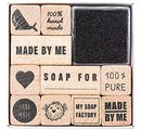 A soap stamp set with 11 parts, especially for the theme "make soaps yourself"! 10 original motifs in a set with a black stamp pad. Included are 5 square stamps measuring 2 x 2 cm and 5 rectangular stamps measuring 4 x 2 cm. Perfect to personalize your creations.
