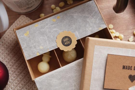 As soon as the hand cream chocolates are in the box, place the overhanging natural paper over the grid and seal it with a sticker.