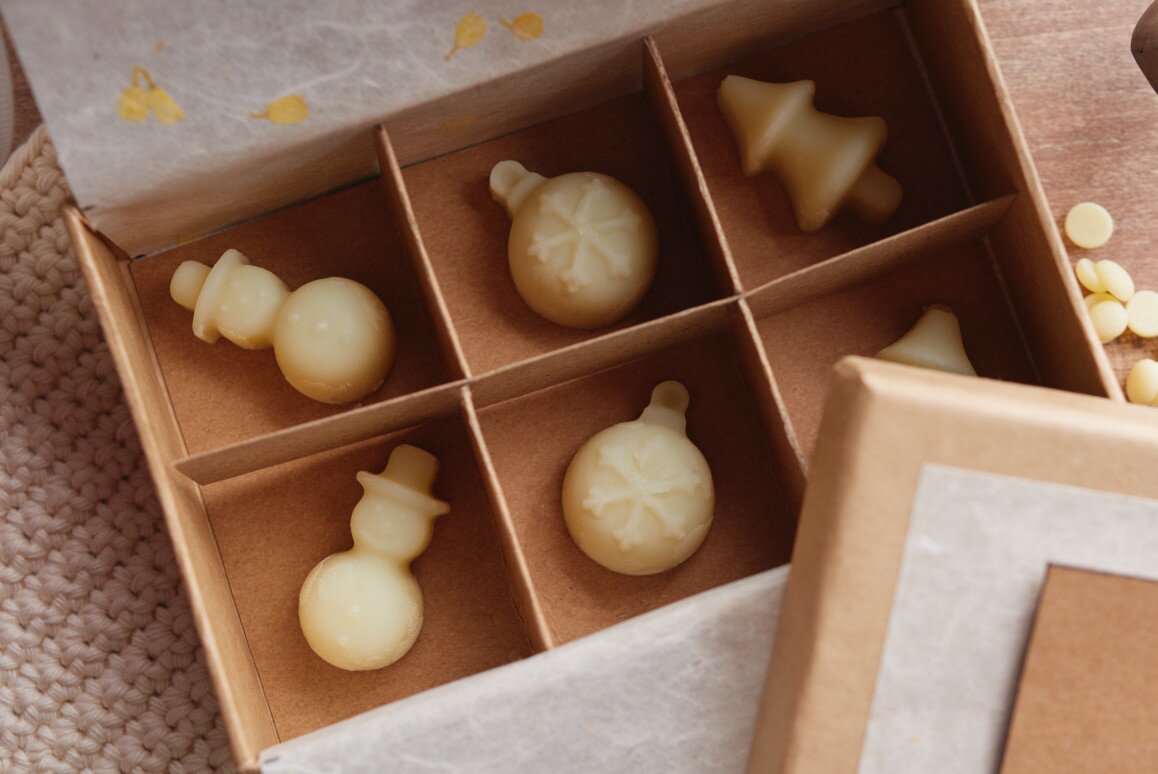 Immediately pour the liquid mixture into the silicone mold without waiting. This will prevent unsightly bubbles from forming in the homemade hand cream chocolates. After about an hour, the individual pieces can be removed from the mold and placed in the gift box.