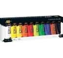 In this set of 10 pieces with 100 ml each, the following colours are included: White, real yellow light, Cadmium Yellow, Genuine Orange, Vermillion, Ultramarine Blue, Yellow Green, Leaf Green, oxide brown and Black.