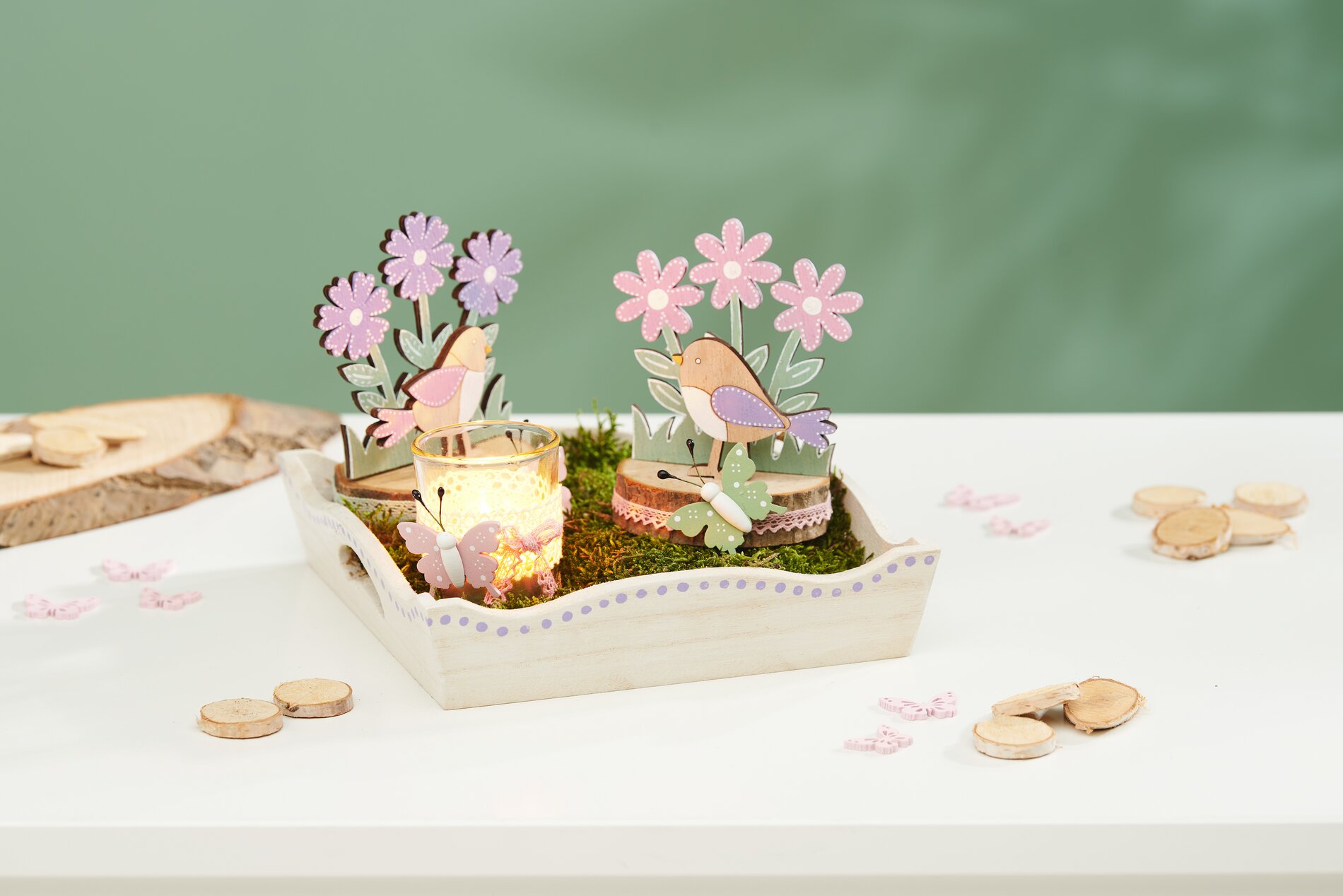 Fill the tray with moss, place the two stick-on motifs and the tea light jar on the wooden tray. Finally, glue on small butterfly scatter pieces as accents - the new table decoration is ready.