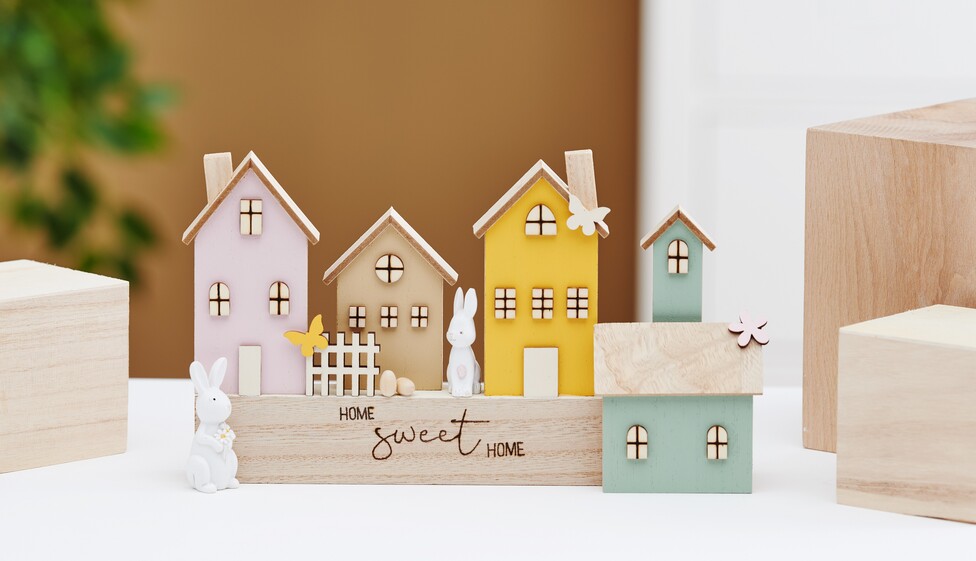 First, the facades of the houses are painted with the colors mentioned above. Then the windows, doors, roofs and chimney can be glued on. To achieve a harmonious effect, we recommend painting the surface of the base antique white. The front of the birdhouse is an ideal surface for hand lettering. Use a branding iron to burn in your lettering as in our example.