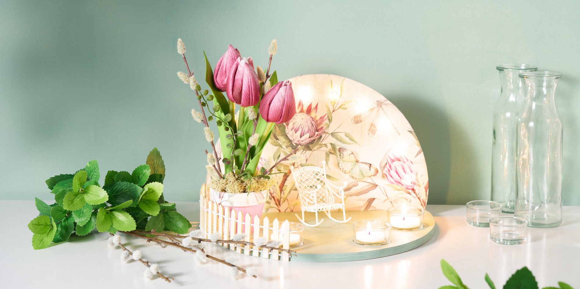For the napkin technique you need the top printed paper layer of the napkin. Coat the dried back wall with napkin varnish and apply the napkin motif over the entire surface. Remove any protruding paper with a scalpel. Coat the entire surface again with napkin varnish.