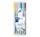 The STAEDTLER fineliners triplus 0.3 "Hygge" pen set consists of 6 fineliners with a metal-cased tip in a practical stand-up box. The line thickness of approx. 0.3 mm allows very fine lines. The triangular shaft ensures relaxed writing. The ink is water-based and can be washed out of most textiles.