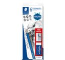 The STAEDTLER Lumograph "Drawing pencils" set includes 6 high-quality hexagonal pencils in assorted hardness grades for writing, drawing, sketching and hatching. Also included are an eraser and a sharpener. From the "Design Journey" design series.