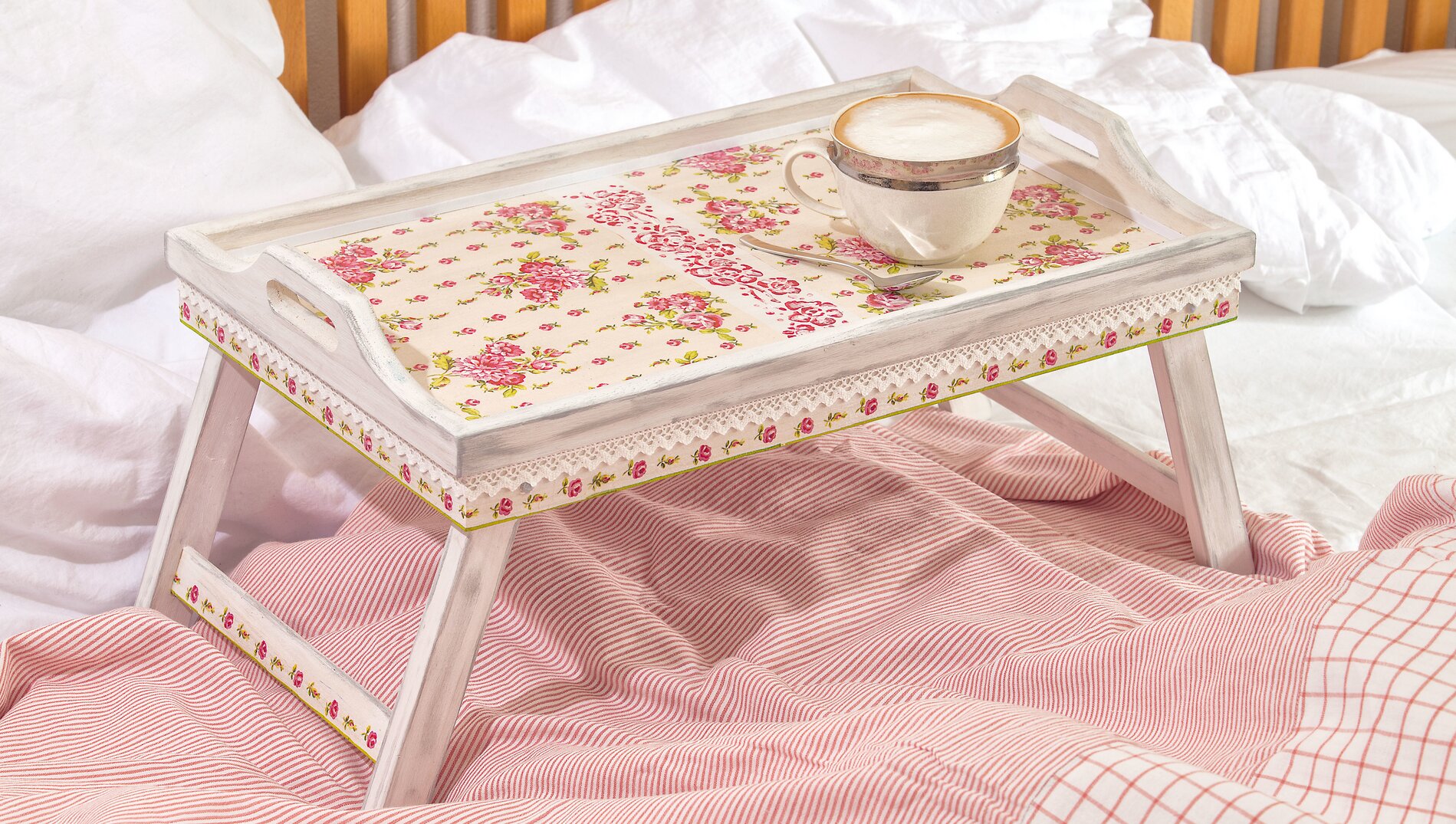 This large, sturdy standing tray is perfectly suited for designing with With a Napkin technique. little trick, the large motifs can be glued on flat without any problems. You'll want to have breakfast in bed every day.
