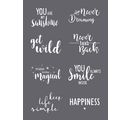 The self-adhesive, reusable Stencil "sayings" represents eight English sayings. It has a soft, fine texture. With the help of the enclosed Scraper the motifs can be easily applied to different surfaces such as wood, Terracotta, Paper, concrete and textiles. The motif size is between approx. 5.2 and 5.7 cm.