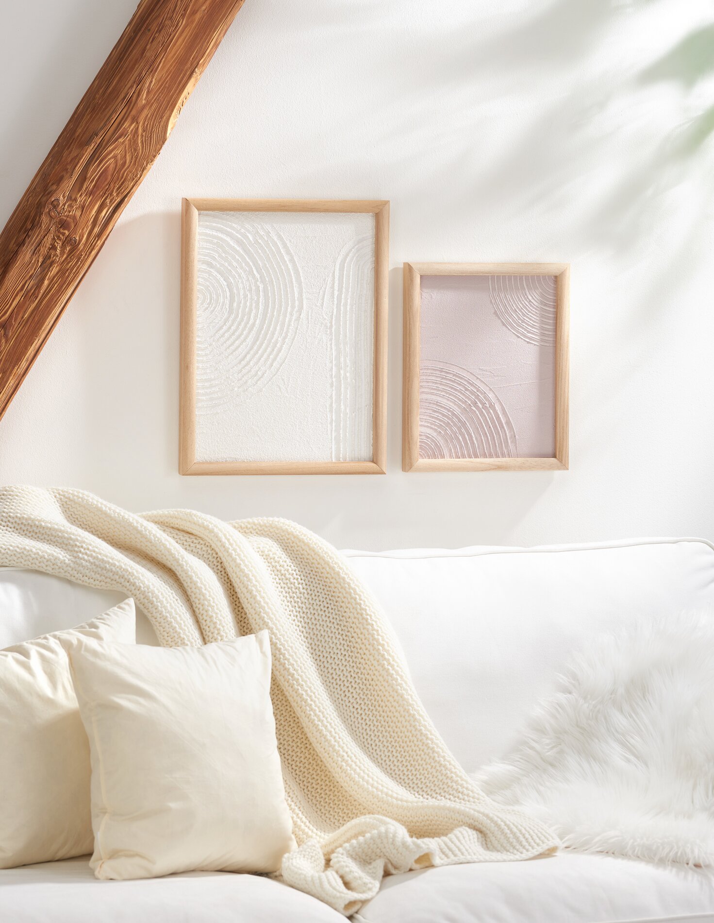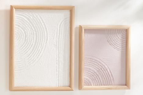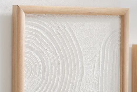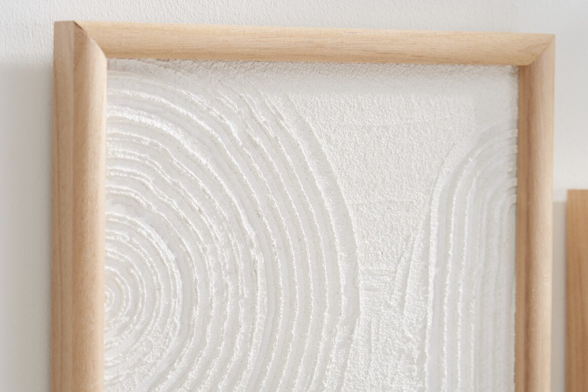 Both pictures are made with white structure paste. The large picture in the format 30 x 40 cm is designed with coarse structure, the mural in the small format of 24 x 30 cm was modeled with colored structure paste with fine grain.