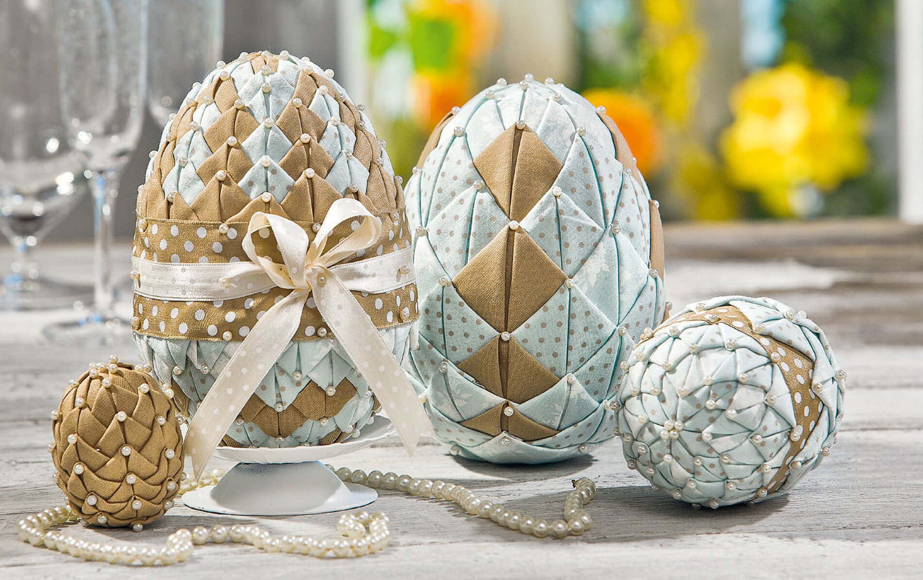 Classic artichoke technique is so beautiful: the decorative eggs look very noble, decorated with harmoniously combined fabrics and pearls.