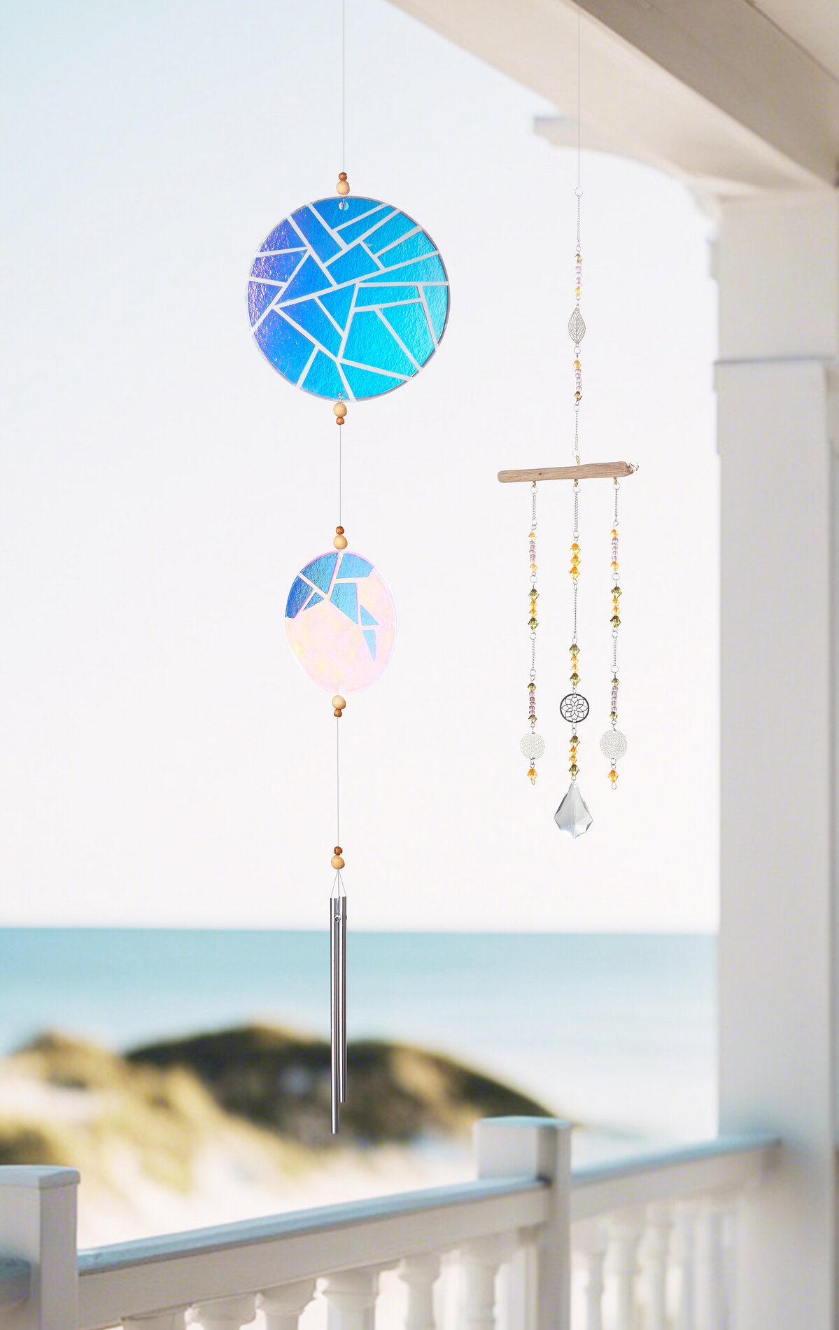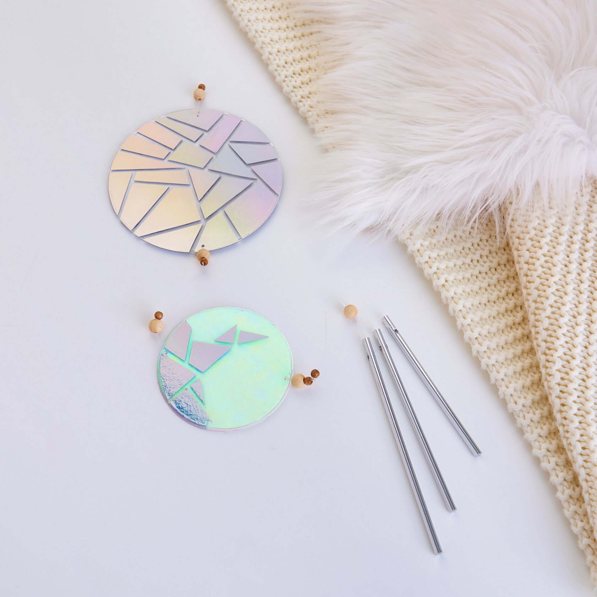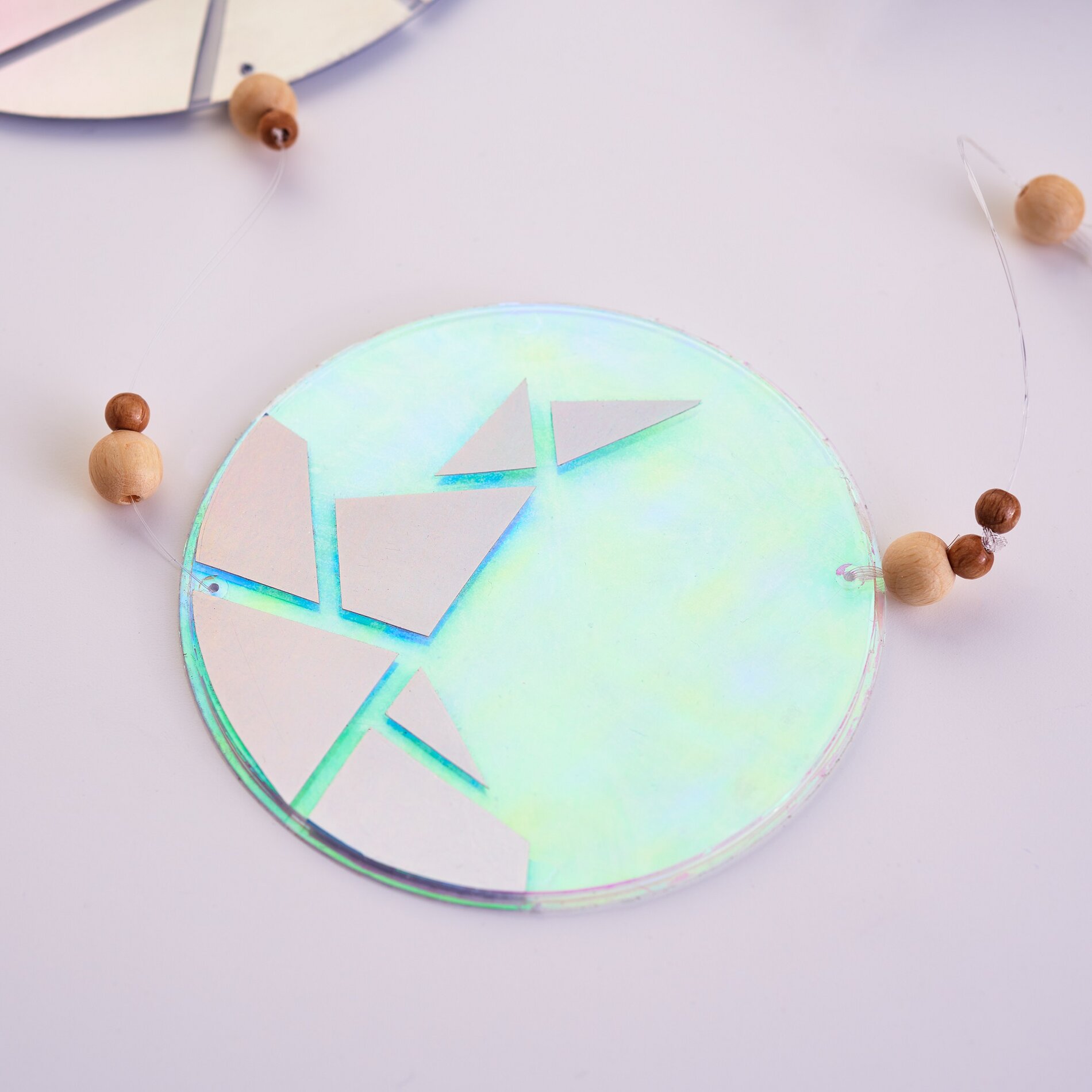 Drill a hole in the large acrylic disc at the bottom. The threads of the small acrylic disc are pulled through this hole and knotted. Finally comes the suspension. The same two wooden beads are threaded on here too.