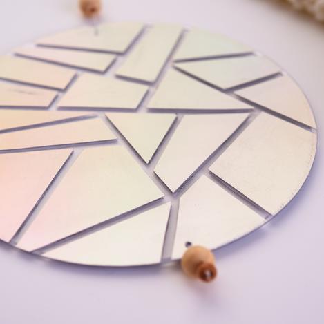 now transfer the templates for both discs to the back of the iridescent paper. Use the graphite paper for this. Cut out a piece, coat the back with napkin varnish and stick it onto the disk. Repeat the process on the reverse side.