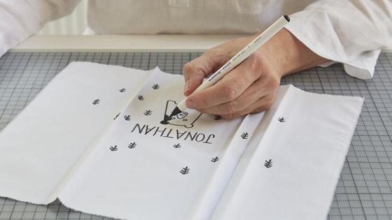 In the next step, place the fabric on the base and draw the desired motif on the appropriate area of the bag using the black textile pen. You can also create a template in advance, which you can place under the fabric and then simply paint over with the textile pen.