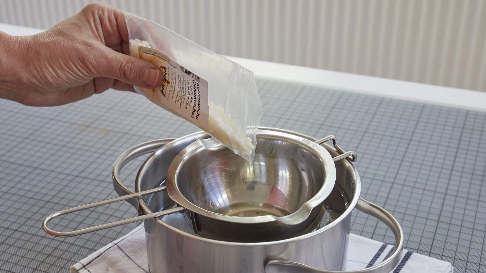 Now prepare the workplace for waxing the fabrics, for example by spreading out a terry towel and placing baking paper on top. Then melt the wax in a pan in a bain-marie according to the instructions.