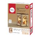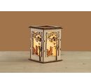 With our Table lantern "Forest" you can easily conjure up a cozy atmosphere in your home. The kit consists of 15 parts that you can easily put together and fix with glue (not included). The lanterns has a size of about 8.5 x 8.5 x 11.7 cm and is made of plywood. It is unpainted and can therefore be designed according to your wishes.