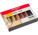 The Talens AMSTERDAM acrylic paint set "Metallic"contains 6 colours with a filling quantity of 20 ml each. The metallic colours have different degrees of coverage. The brilliant colours can be diluted with water