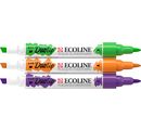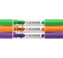 Talens Ecoline Duotip "Secondary color set" with colors 548 Blue Violet, 601 Light Green and 236 Light Orange. 3 colors that should not be missing in your collection. The brilliant colors based on dye and gum arabic will delight you. Duotip markers contain concentrated, transparent watercolor paint. The pens are equipped with 2 different tips, a narrow ball tip and a wider wedge tip. This gives you the freedom to draw fine and wide lines or color larger areas.
