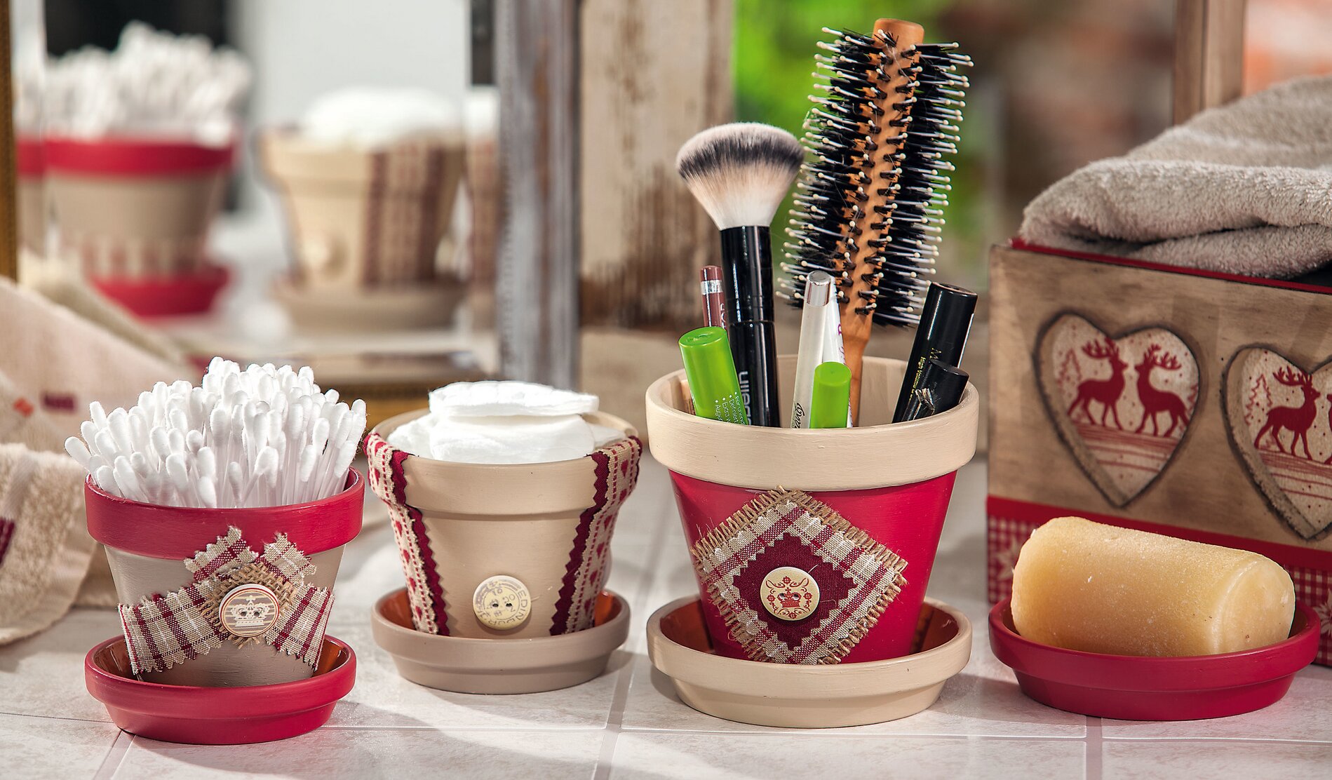 Paint pots and saucers with crimson Handicraft paint and a color mixture from Grey Brown with something Beige. After drying, cut squares and strips of any size from the fabrics and plucking with the pinking shears and stick them onto the pots with Handicraft glue . The pinking shears do not give only a decorative fabric edge, and the fabric does not fray out so quickly at the edges. Finally, glue only some buttons onto the pots.