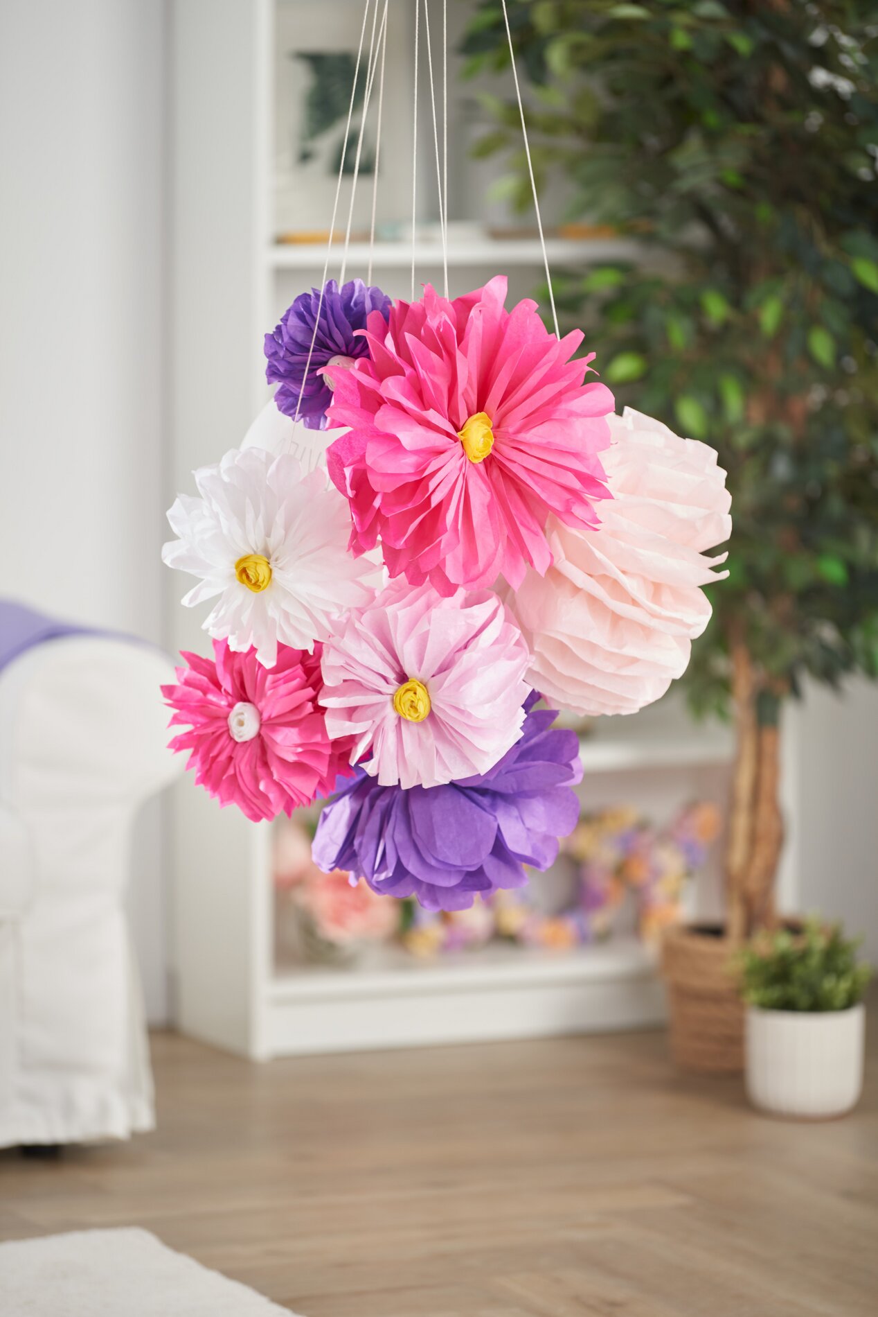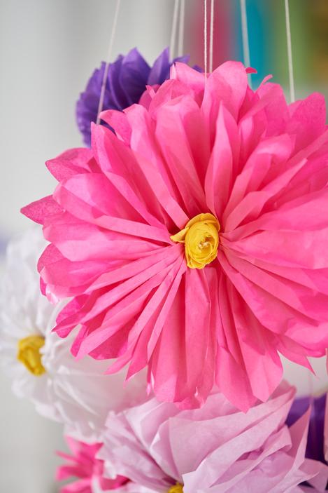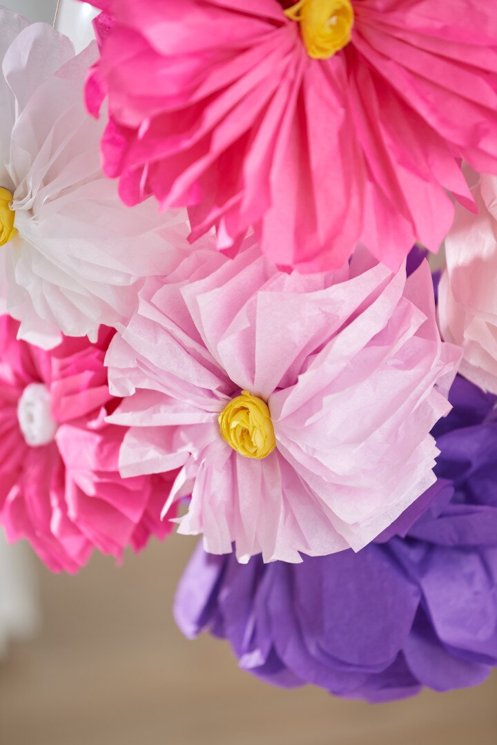 The paper flowers pompons in our decoration example have a size of about 25 cm to 40 cm.