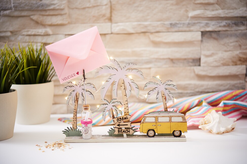 Place it in a position that complements the overall look of the decoration. Now insert the memo holder into the bottle. This will allow you to place your voucher envelope later.