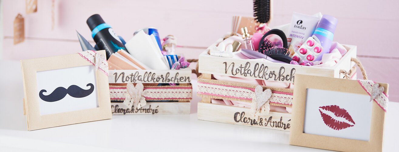 Slowly we are on the home stretch and the day of days is coming closer..Of course, we shouldn't forget the ring pillow, the emergency basket and a small present for our guest!