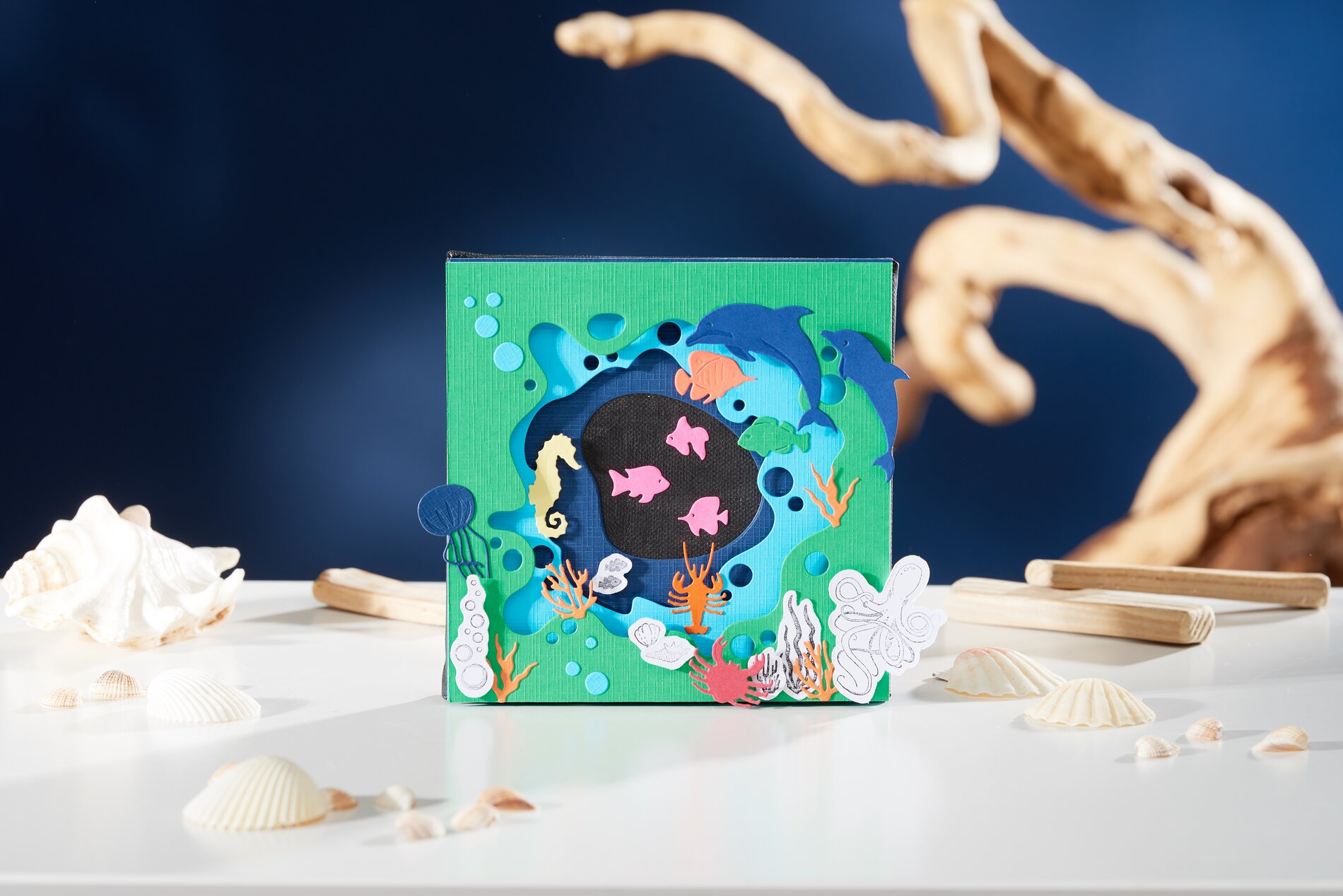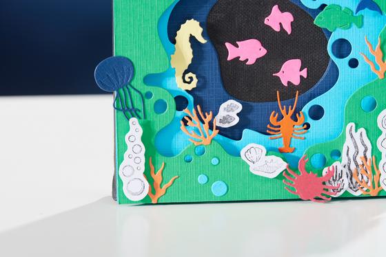 The inhabitants of the underwater world are created from various punching templates, silicone stamps and coloured paper. These are then simply glued on with VBS craft glue No. 182. You can give free rein to your creativity when arranging them.