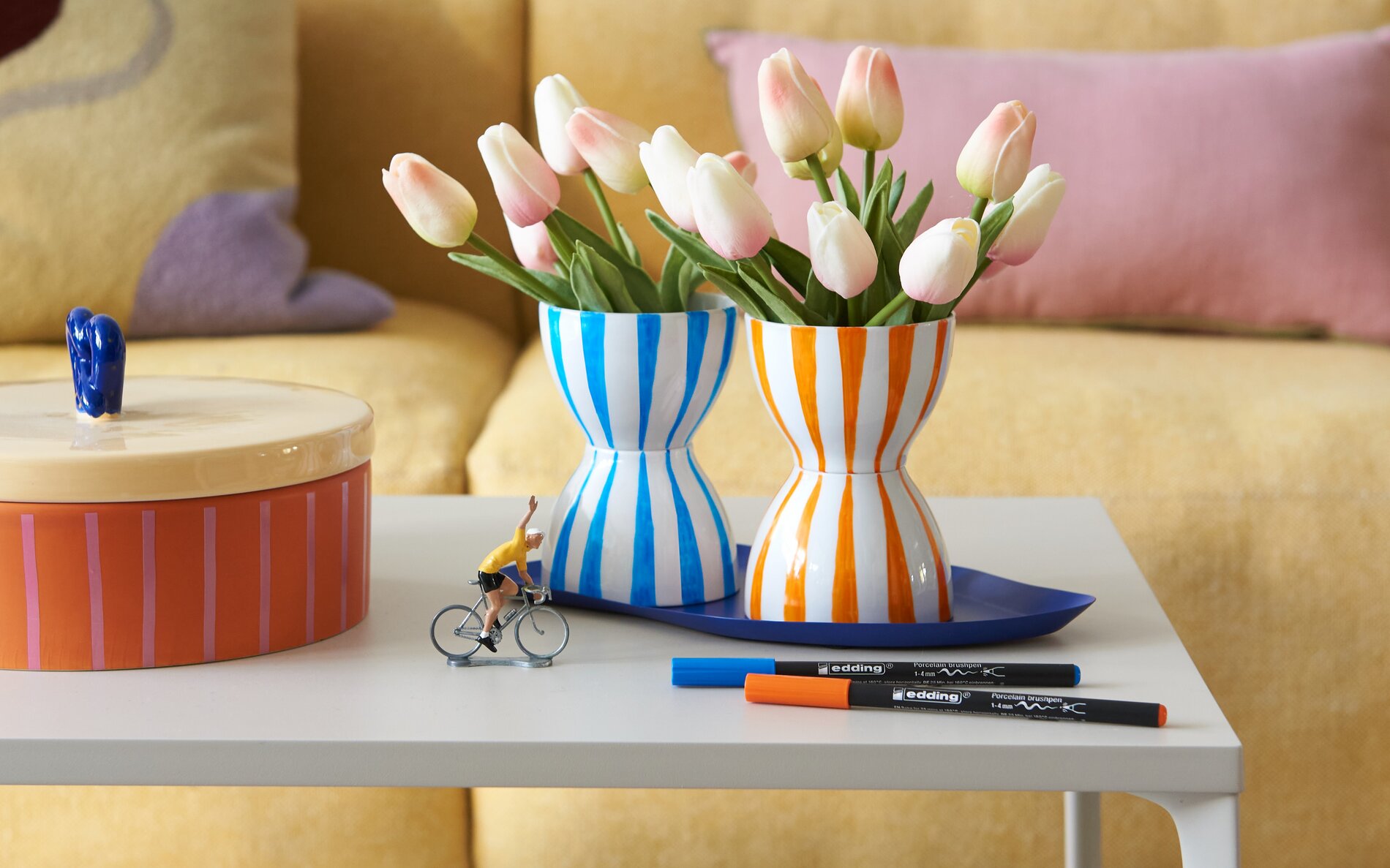 Now you can use the edding 4200 Porcelain Brushpens to design the cups as you wish. Whether stripes, circles, dots, flowers, fruit or hearts - there are no limits to your creativity!